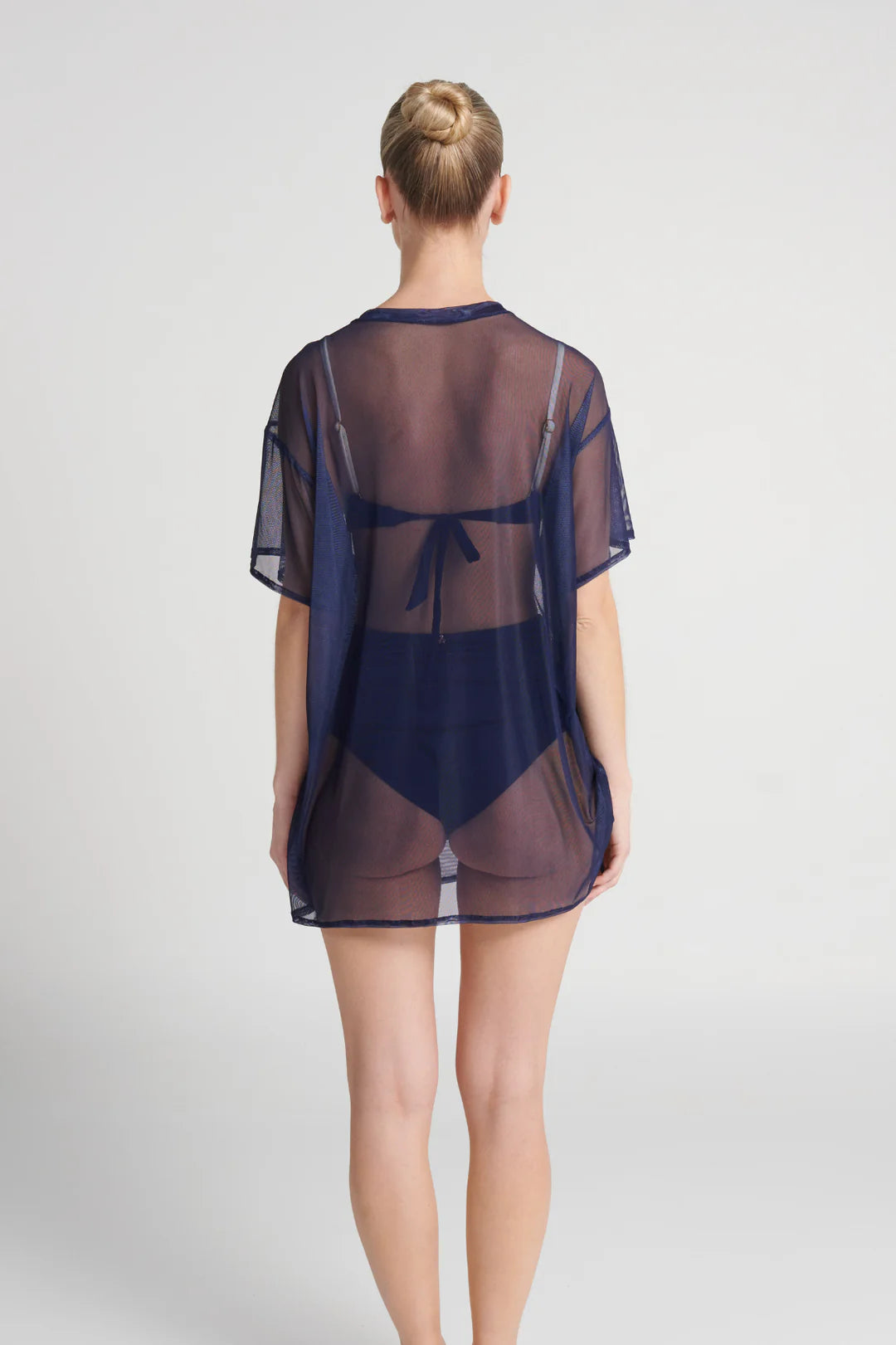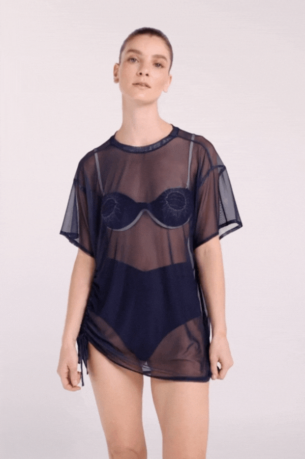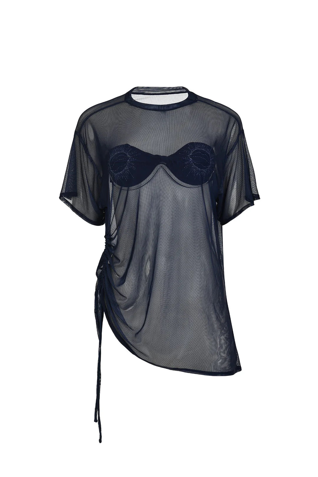 Oversized mesh blouse with a placed print. Features a gathered tunnel on one side for an adjustable length.