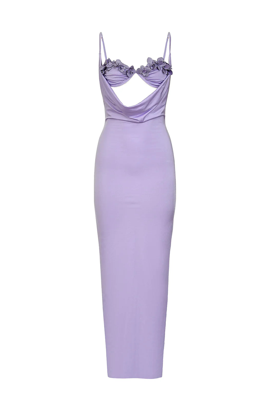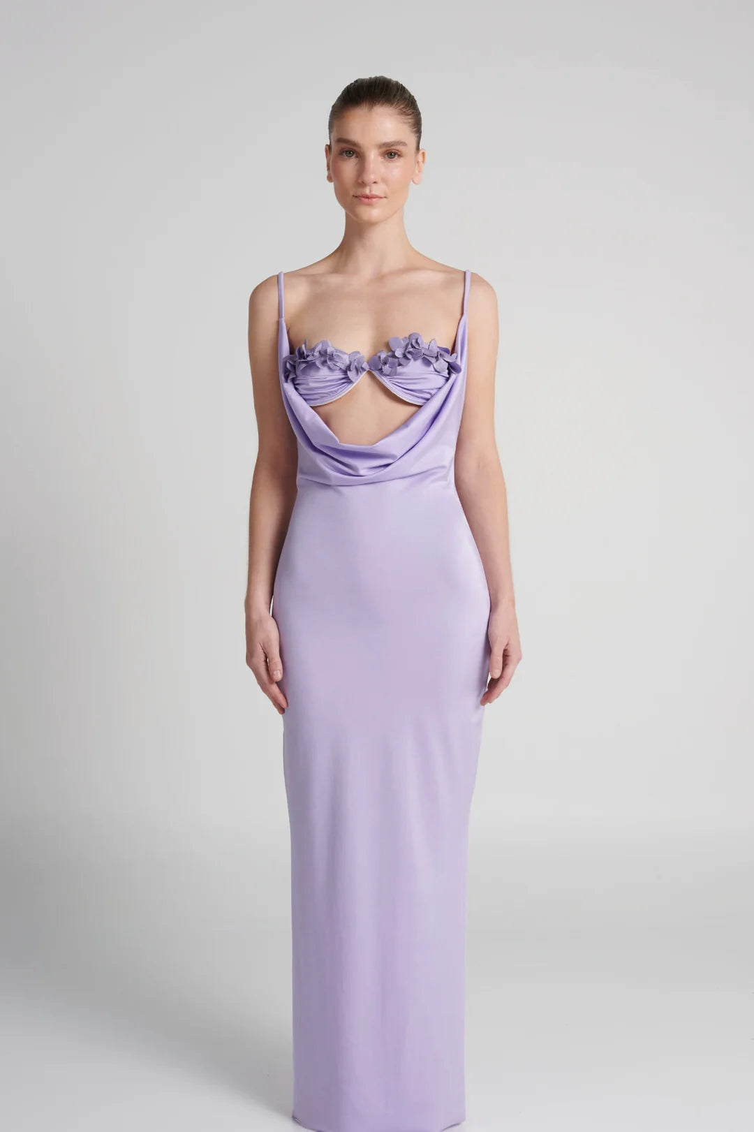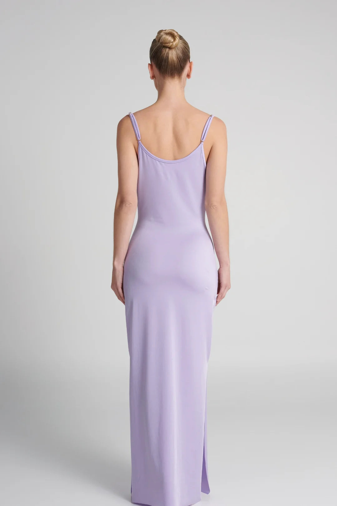 Draped Lycra Dress with a sleek design. It features fixed adjustable straps with gold-plated adjusters, side slits, and a front drape for added movement and style. (Top not included).