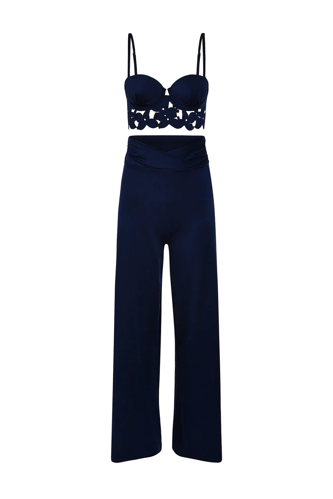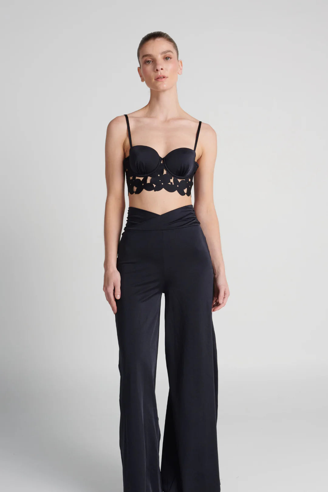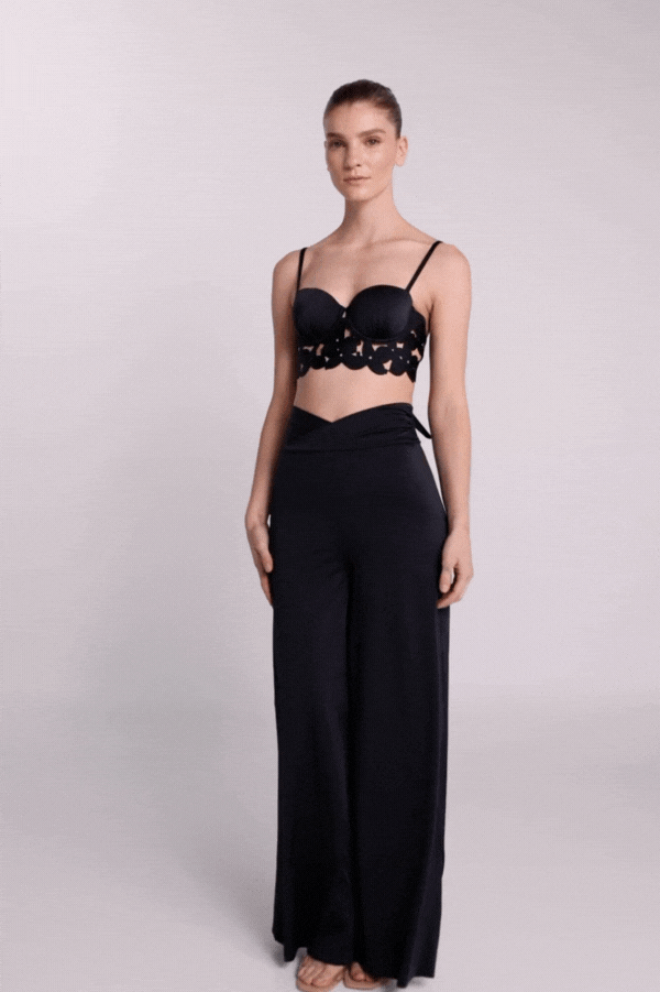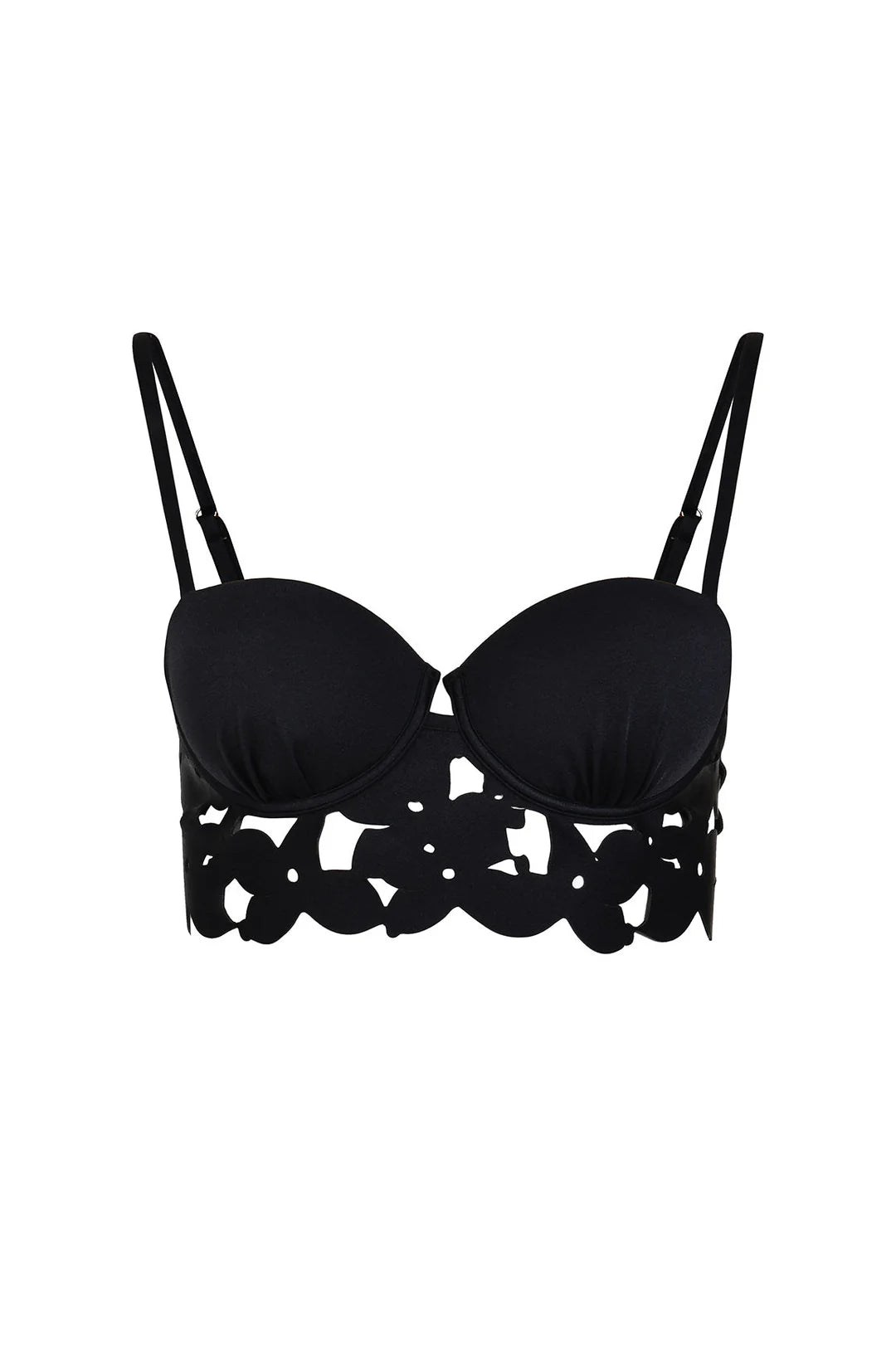 Fixed-cup top with underwire, laser-cut body with double lamination. Features adjustable straps with sliders and gold-plated rings. The back is adjustable.